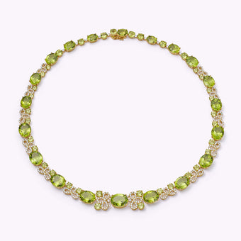 Peridot has long been Kiki’s favourite gemstone, with its distinctive green hue reminiscent of well-groomed summer grass. Peridot was first mined in Zabargad, an island in the Red Sea, during the rule of ancient Egyptians. Adored for its yellow-toned green sparkle, they believed it to be the “gemstone of the sun”. Thought to cleanse the mind and promote peace and compassion, peridot has been a standout gem of Kiki’s collections for many years. To commemorate Kiki’s love of peridot, we’ve paired a specially sourced selection of gems with bursts of diamonds in a statement necklace, earrings, ring and bracelet, set in 18ct yellow gold.