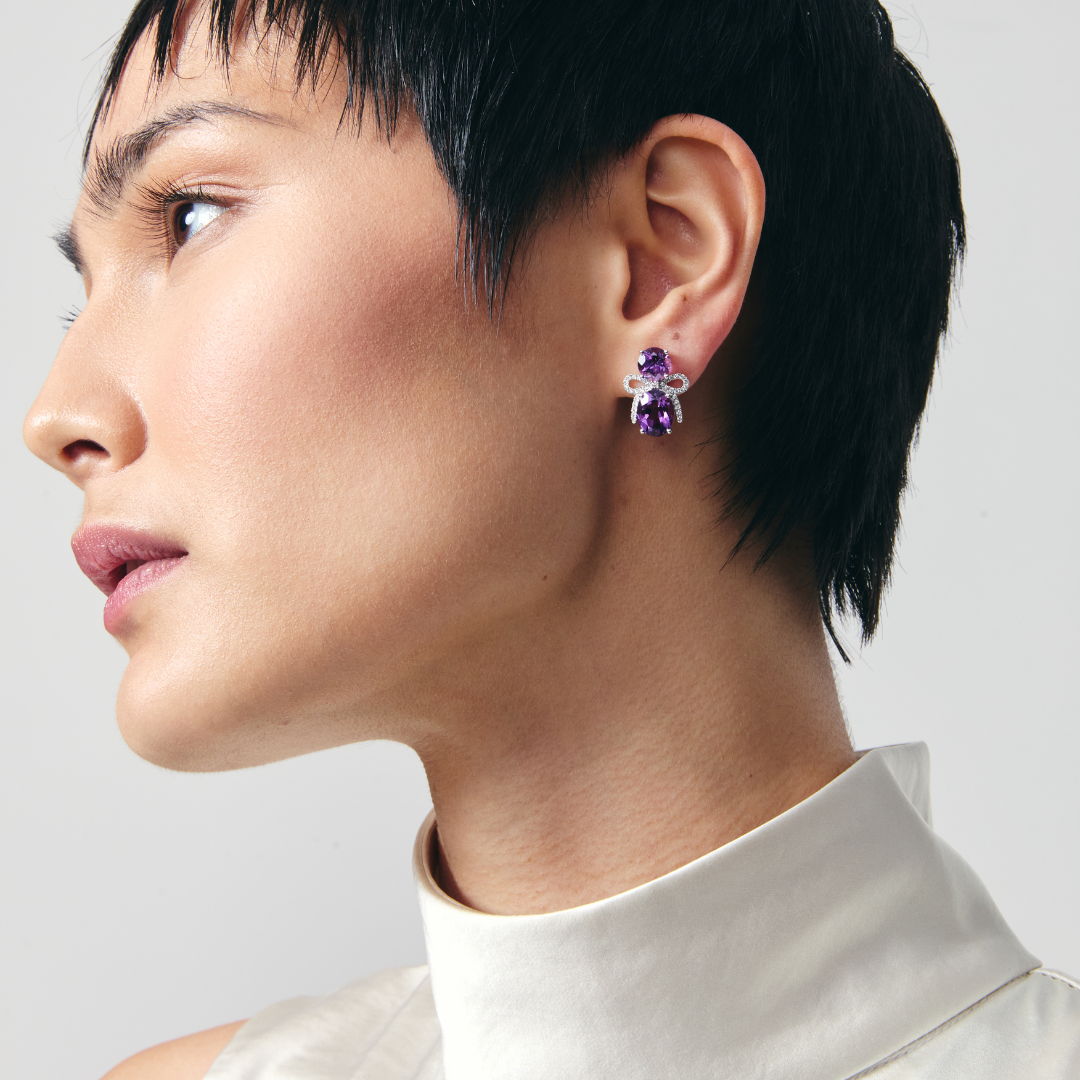 Captivating elegance exudes from these timeless bow earrings. Crafted in 18ct white gold, two vivid amethyst gemstones beautifully contrast with a brilliant diamond bow. Enhance your outfit with a bold burst of colour that will be treasured for generations to come (amethyst is approximately 9.00ct, diamond is 0.35ct).