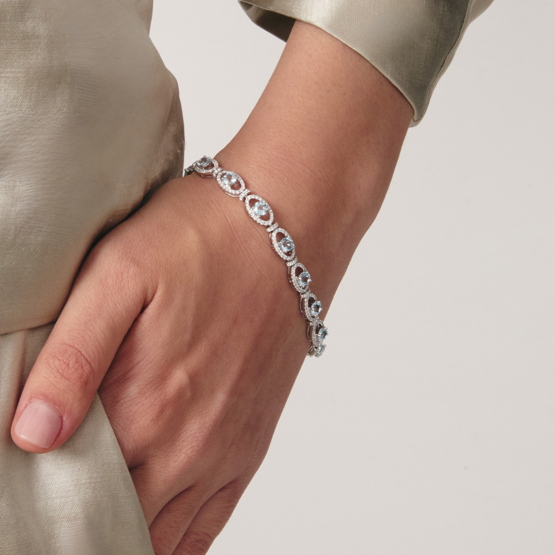 A beautiful contemporary design, our Signatures Blue Topaz and Diamond bracelet in 18ct White Gold is the perfect accessory to elevate the everyday.