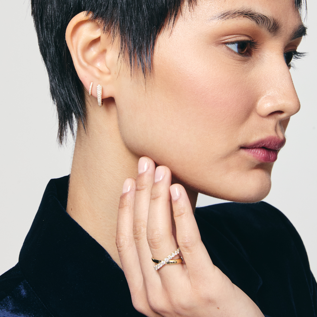 A sparkling twist on our plain cross-over ring. This ring will become your new everyday staple with it’s simple and chic cross-over design, set in 18ct Yellow Gold with a single row of Diamonds.