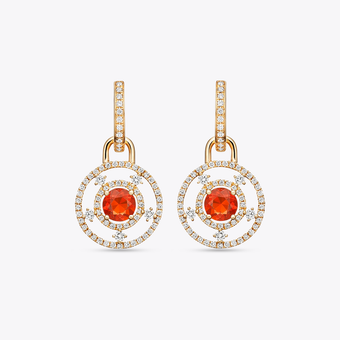Exquisite 18ct Yellow Gold detachable drop earrings set with intricate Diamond circles encasing beautiful Fire Opal stones (Diamond is approximately 0.61ct & Fire Opal is 0.64ct). Wear the hoops on their own or add the drop for a stunning classic look. Build your collection of Kiki drops; they all fit on our Kiki Hoops Classic or Plain.