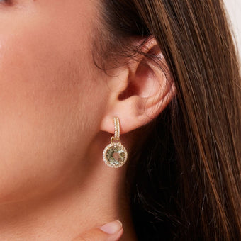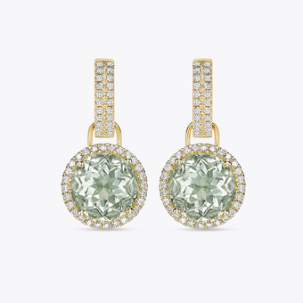 Two looks in one make these earrings an irresistible buy; Green Amethyst and Diamond detachable round drops in 18ct Yellow Gold, on stunning 18ct Yellow Gold and double Diamond hoops (Green Amethyst is approximately 6.50ct and Diamond 0.45ct).