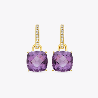 Two looks in one make these earrings an irresistible buy; featuring purple Amethyst cushion drops on elegant 18ct Yellow Gold and Diamond hoops. Wear the hoops on their own or add the drop for a different look.