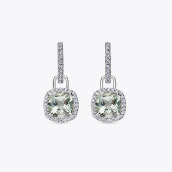 Green Amethyst Kiki cushion drop earrings have a new look! Now with a halo of Diamonds to add even more sparkle to your favourite earrings.