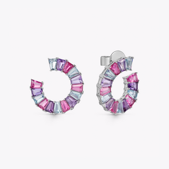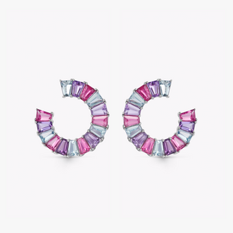 These statement graduated aquamarine, pink tourmaline and amethyst earrings are set in 18ct white gold and curl delicately around the ear. Inspired by Kiki's joyous childhood memories at the funfair, these earrings are contemporary, fun, and filled with vibrant gemstones (gemstone weight is approximately 5.38ct).