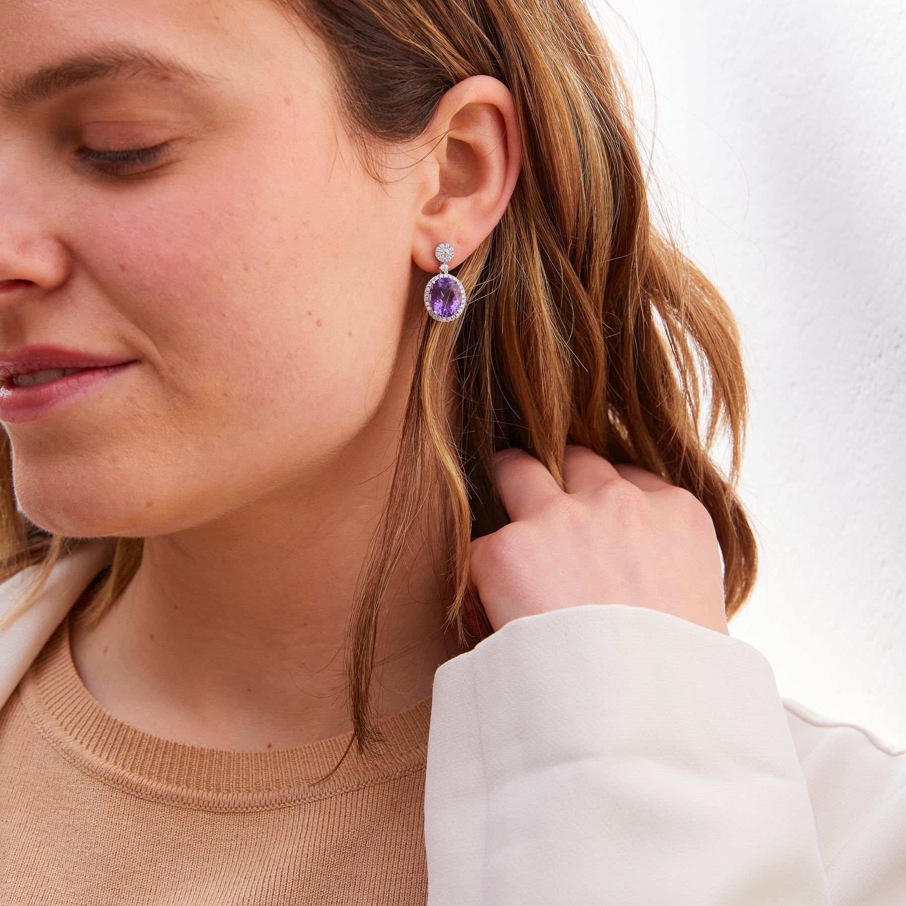 These stunning earrings feature a central oval-cut Amethyst stone, set in 18ct White Gold, surrounded by a row of pave Diamonds and hang gracefully from a simple Diamond stud.