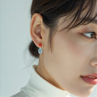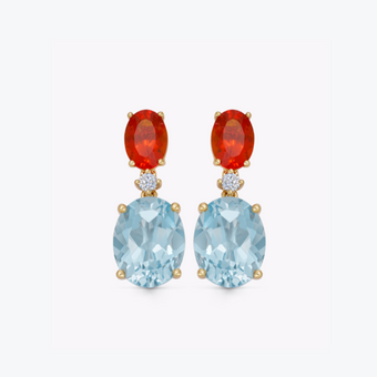 These stylish earrings feature blue topaz and fire opal gemstones set in 18ct yellow gold with a sparkling diamond accent. Perfect for adding a subtle pop of colour to your outfit no matter the occasion (blue topaz is approximately 6.23ct, fire opal is 1.45ct, diamond is 0.09ct).