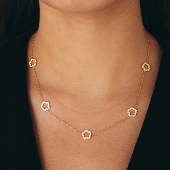 This pretty Eden pave Diamond five flower necklace on a delicate 18ct Yellow Gold chain is perfect for everyday wear, and also makes a beautiful present. (Diamond is approximately 0.48ct)