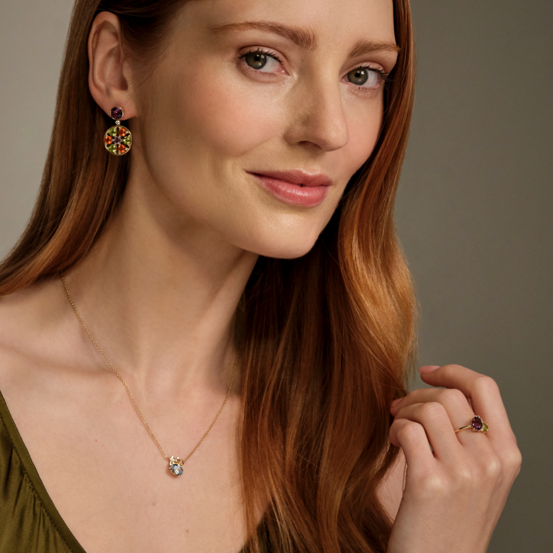 This playful amethyst, peridot, and pavé diamond star 'Cluster' ring is set in 18ct yellow gold (amethyst is approximately 1.22ct, peridot is 0.51ct, diamond is 0.10ct).