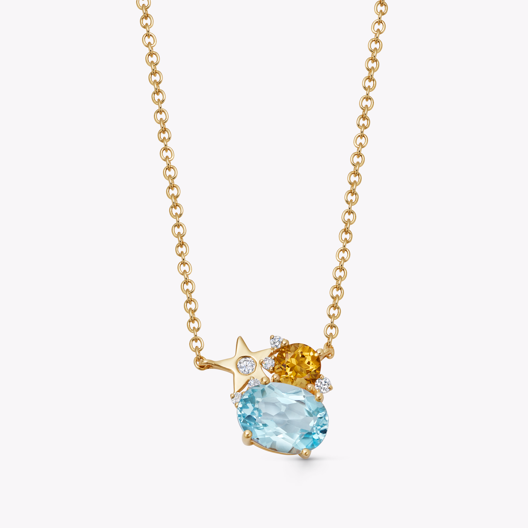 This playful blue topaz, citrine, and diamond star 'Cluster' necklace is set in 18ct yellow gold (blue topaz is approximately 1.61ct, citrine is 0.25ct, diamond is 0.05ct).