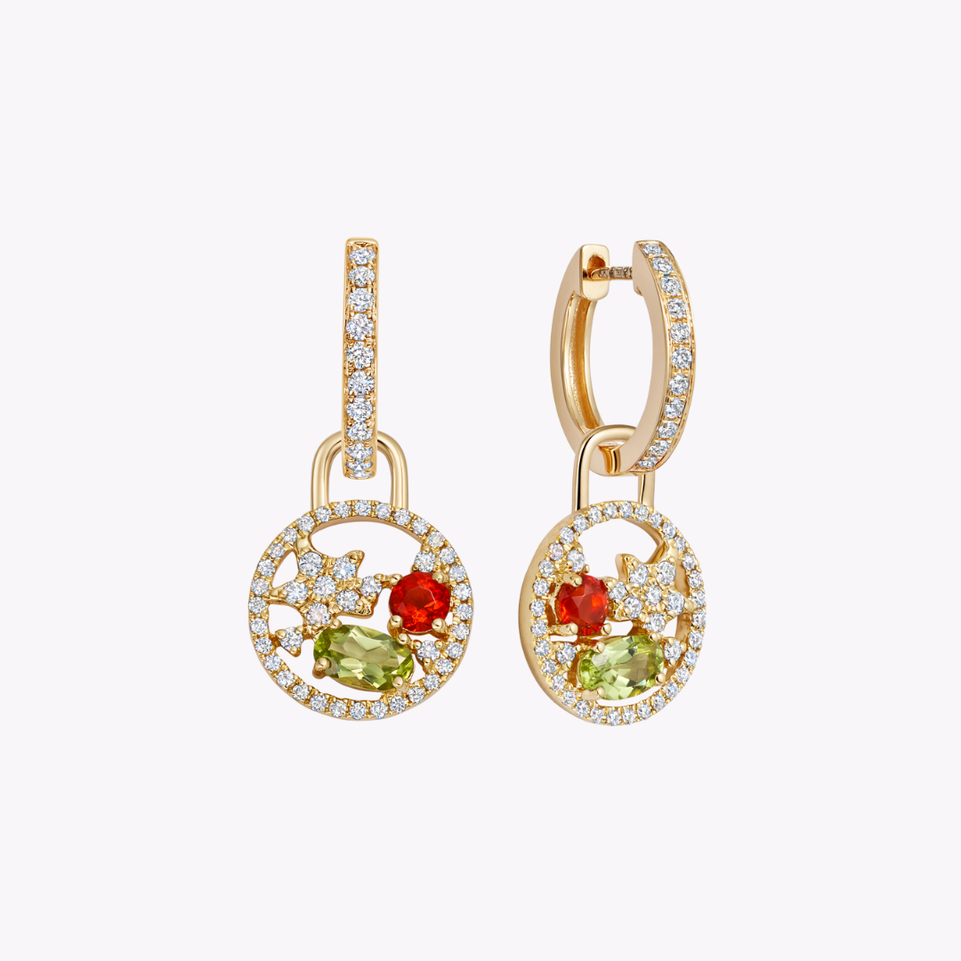 Add these peridot, fire opal and diamond star 'Cluster' drops in 18ct yellow gold to your Kiki Hoops for a playful addition to your detachable drops collection (peridot is approximately 0.51ct, fire opal is 0.24ct, diamond is 0.30ct).
