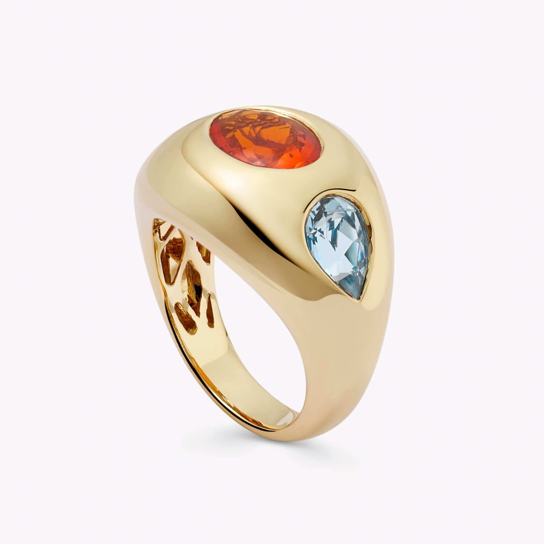 Everyday Gold is all about letting your jewellery do the talking for your day-to-day. This 18ct yellow gold domed ring features an oval fire opal gemstone flanked by two pear blue topaz stones and will take you from the office to your evening drinks party (fire opal is approximately 1.08ct and blue topaz is 1.74ct).