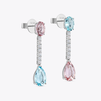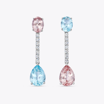 Adorn yourself with these one-of-a-kind earrings featuring majestic aquamarine and morganite gemstones, featuring a line of sparkling diamonds for an exquisite, luxurious look. Perfect for any formal occasion, these timeless, unique earrings will add an air of sophistication and elegance to your ensemble.(Morganite is approximately 4.13ct, Aquamarine is 3.61ct and Diamond is 0.48ct)