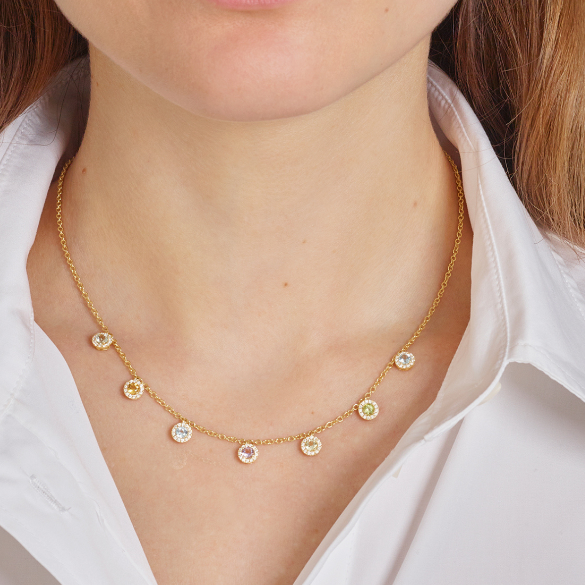 This delicate and understated Grace multi-gemstone drop necklace features citrine, blue topaz, peridot, amethyst and white topaz in seven mini drops surrounded by dazzling diamonds, set in 18ct yellow gold (gemstone weight is approximately 1.58ct and diamond is 0.35ct).