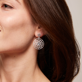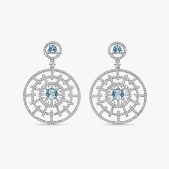 Introducing the striking new additions to our Kiki Diamonds collection. Inspired by the Winter ballet “Les Patineurs” these stunning pieces evoke images of sparkling sunlight shimmering on ice and snow. Set in 18ct white gold, featuring a distinctive blue topaz centre and exquisite diamond work, these statement earrings are pure joy, guaranteed to add opulence to any occasion.