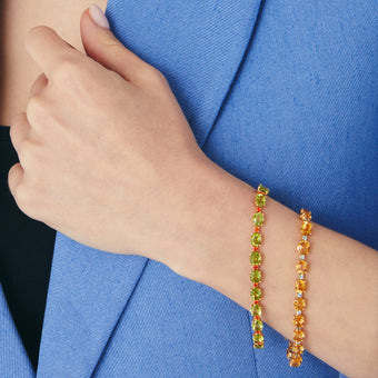 This exquisite bracelet features a fusion of precious stones, crafted in 18ct yellow gold. Citrine and blue topaz gems are interspersed, creating an elegant piece of jewellery that is sure to turn heads. This timeless tennis bracelet is perfect for the summer season and comes in an array of colours.