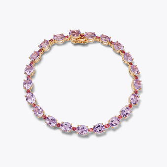 This exquisite bracelet features a fusion of precious stones, crafted in 18ct yellow gold. Lavender amethyst and pink tourmaline gems are interspersed, creating an elegant piece of jewellery that is sure to turn heads. This timeless tennis bracelet is perfect for the summer season and comes in an array of colours.