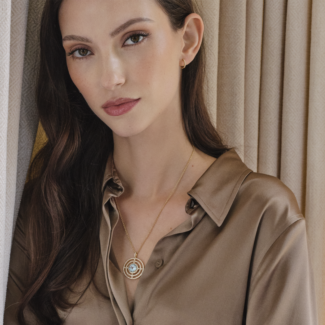 This statement pendant features a central Blue Topaz stone enveloped in radiating rows of pave Diamonds and set in 18ct Yellow Gold (Diamond is approximately 1.11ct and Blue Topaz is 4.50ct). The chain included is adjustable between 18" and 20" so that you can adapt the style to your outfit.