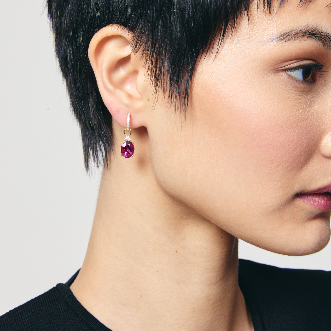 Add an eye-catching pop of colour to your Kiki hoops with these oval rhodolite garnet and tri diamond detachable drops in 18ct yellow gold (rhodolite garnet is approximately 5.30ct, diamond is 0.12ct).