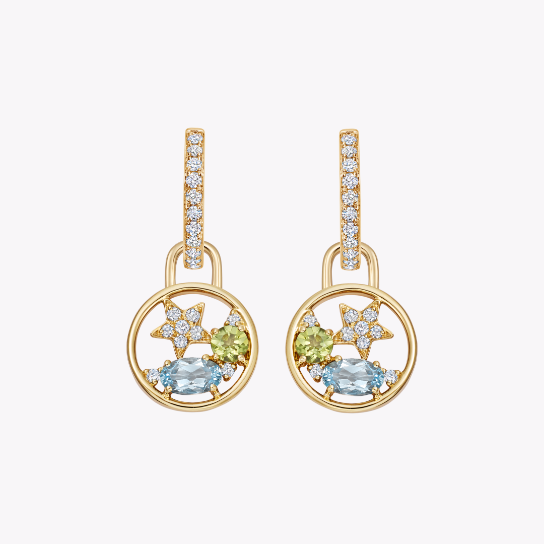 Add these blue topaz, peridot and diamond star 'Cluster' drops in 18ct yellow gold to your Kiki Hoops for a playful addition to your detachable drops collection (blue topaz is approximately 0.60ct, peridot is 0.26ct, diamond is 0.12ct).