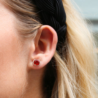 One of Kiki’s most popular styles, these simple and delicate earrings can be worn everyday. Each earring features a round Fire Opal gemstone surrounded by small Diamonds set in 18ct Yellow Gold. (Diamond is approximately 0.19ct and Fire Opal is 2.55ct)
