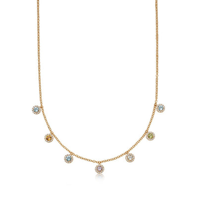 This delicate and understated Grace multi-gemstone drop necklace features citrine, blue topaz, peridot, amethyst and white topaz in seven mini drops surrounded by dazzling diamonds, set in 18ct yellow gold (gemstone weight is approximately 1.58ct and diamond is 0.35ct).