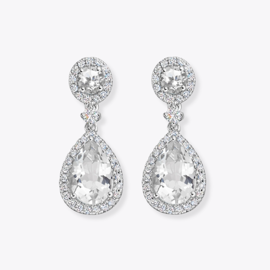 Crafted in 18ct white gold, these elegant Grace earrings feature round and pear-cut white topaz gemstones in a sparkling diamond halo (white topaz is approximately 2.88ct and diamond is 0.35ct).
