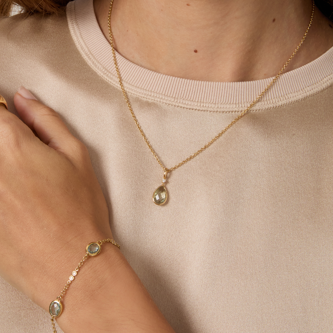 A simple and extremely wearable style, this pendant features a pear drop Green Amethyst set in 18ct Yellow Gold. Perfect for adding a touch of colour to your outfit. (Green Amethyst is approximately 2.45ct)
