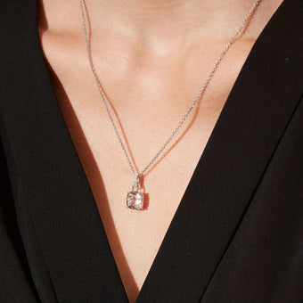You have the cushion drop earrings – now add to your collection with matching rings and pendants. Kiki’s signature cushion cut Morganite stone – set on an 18ct White Gold loop with Diamonds – on an 18" inch White Gold chain.