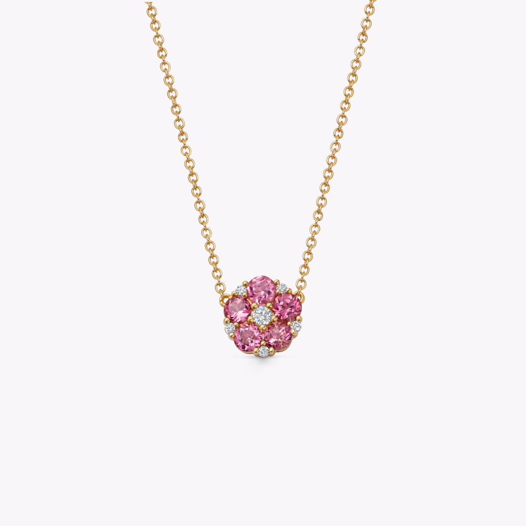 Better than any bouquet, this flower motif necklace pairs vibrant pink tourmalines with sparkling diamonds, set in 18ct yellow gold (pink tourmaline is approximately 0.89ct, diamond is 0.11ct).