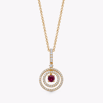 January's Birthstone rhodolite garnet is surrounded by two diamond-set loops and set in 18ct yellow gold.  Adjustable 18inch chain included.