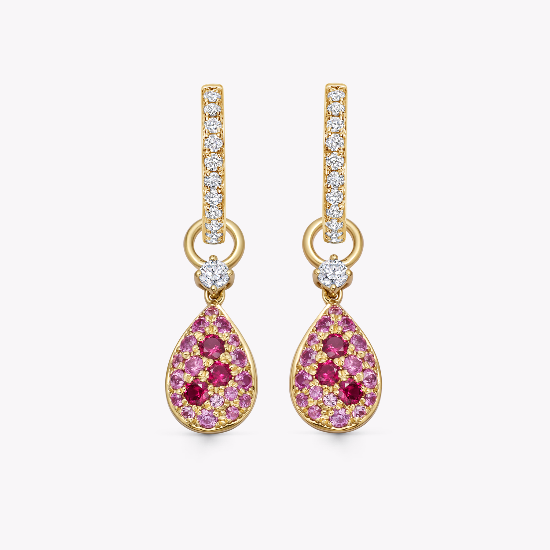Add a touch of romance to your Kiki Hoops with these pear-shaped scatter pavé pink sapphire, ruby and diamond detachable drops (ruby is approximately 0.22ct, pink sapphire is 0.42ct, diamond is 0.09ct).