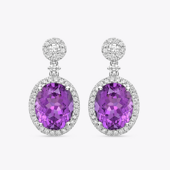 These stunning earrings feature a central oval-cut Amethyst stone, set in 18ct White Gold, surrounded by a row of pave Diamonds and hang gracefully from a simple Diamond stud.