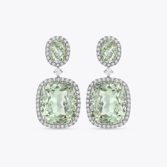 A wonderful pair of Green Amethyst oval and cushion cut stones surrounded by Diamonds set in 18ct White Gold.