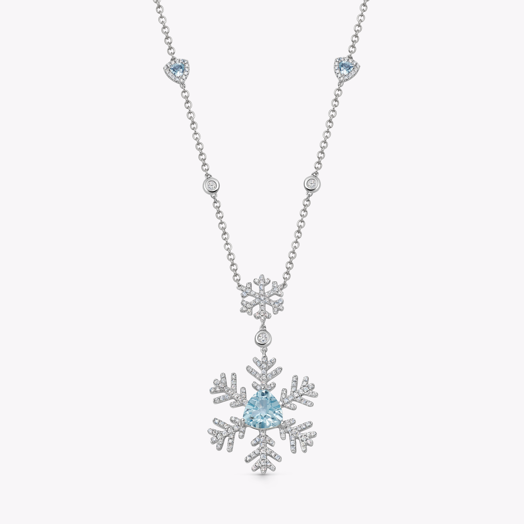 The Snowflake Collection encapsulates the beauty of nature’s unique icy creation and is inspired by Christmas, Kiki's favourite time of year. This statement Snowflake sautoir necklace features a central blue topaz gemstone with diamond detailing in 18ct white gold, perfect for your upcoming winter parties (blue topaz is approximately 2.78ct, diamond is 1.78ct).