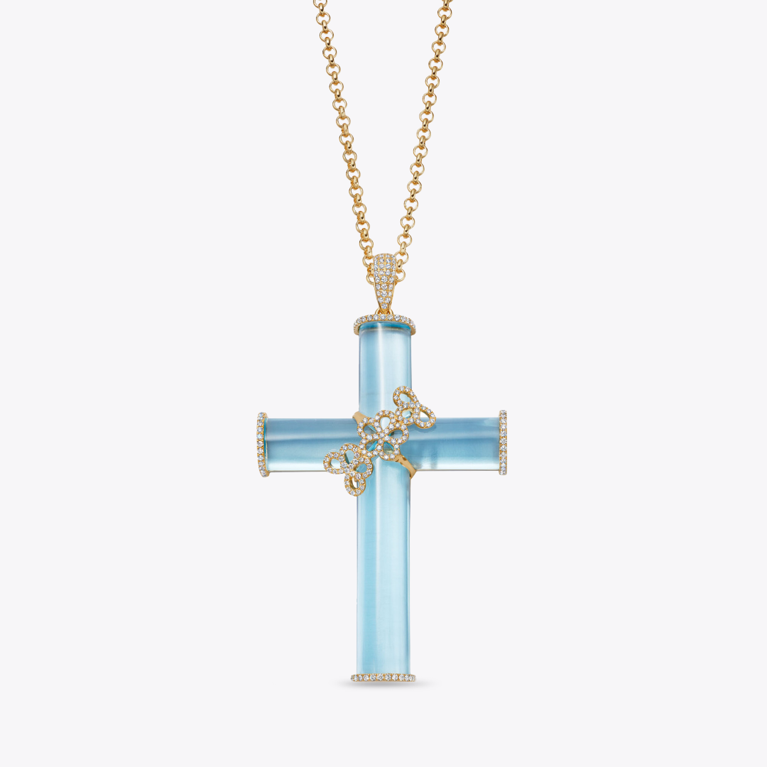 This statement Special Editions pendant features a sky-blue topaz cabachon cross caressed by diamond daisies and set in 18ct yellow gold. Chain sold separately (Blue Topaz is approximately 72.92ct and Diamond is 0.75ct)