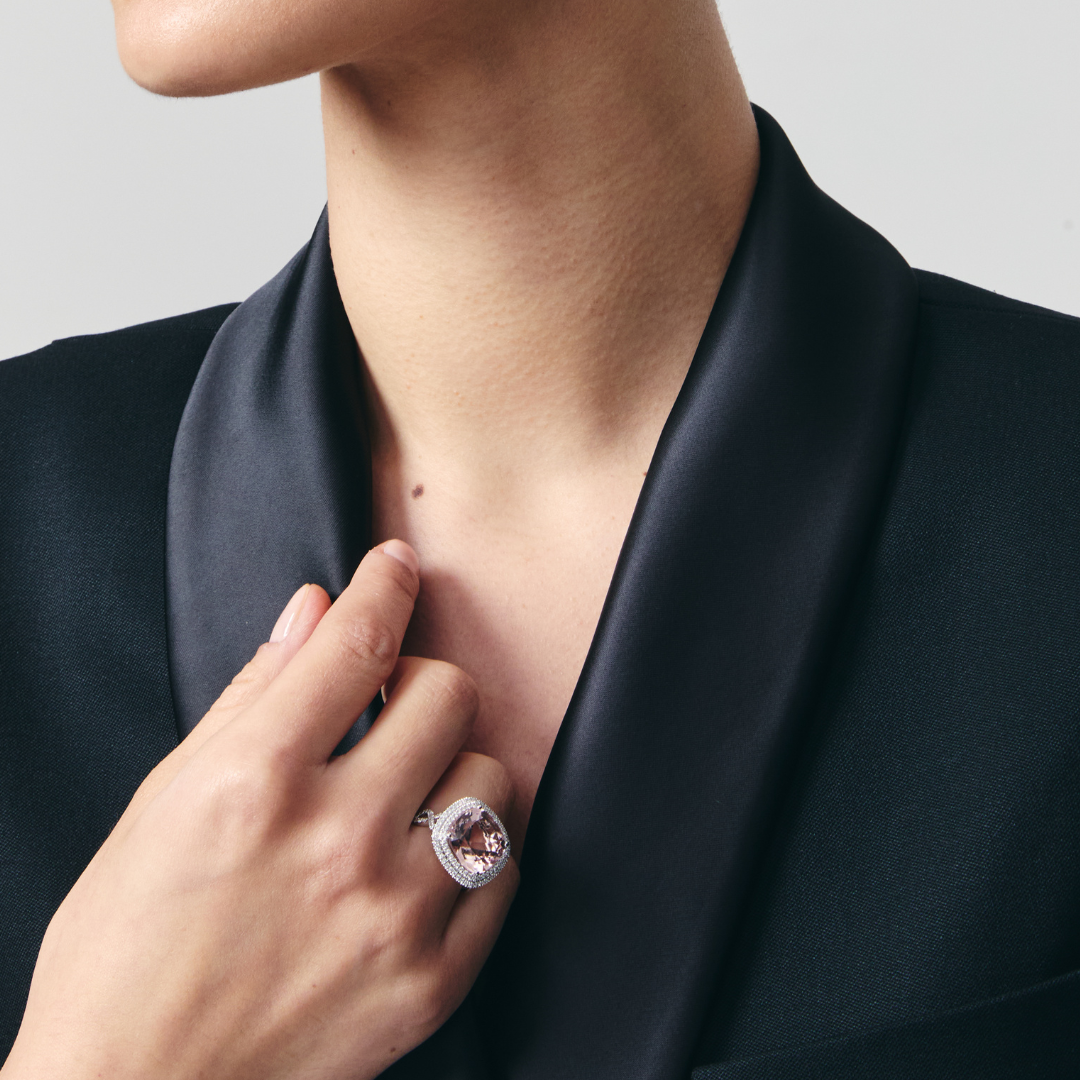 This beautiful cocktail ring features a captivating morganite gemstone surrounded by a double diamond halo for maximum sparkle, set in 18ct white gold (morganite is approximately 8.76ct, diamond is 0.66ct)