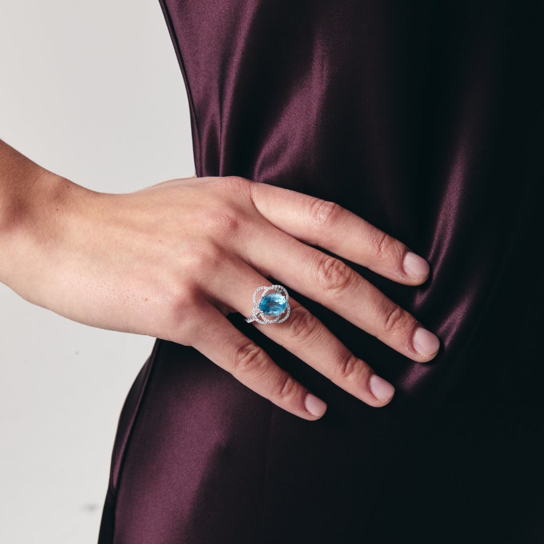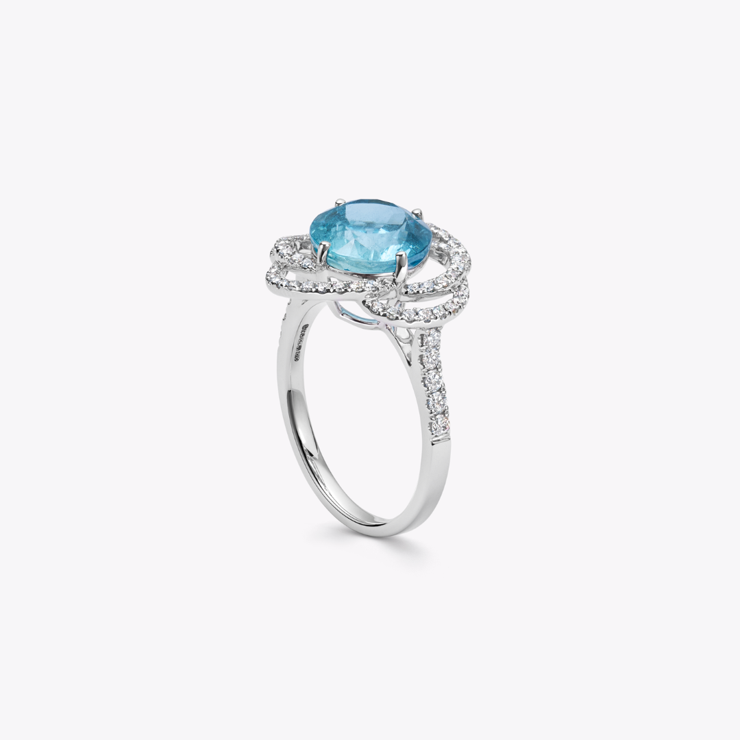A vibrant blue aquamarine gemstone sits within diamond wave detailing, set in 18ct white gold. The perfect cocktail ring for your next special occasion (aquamarine is approximately 3.67ct, diamond is 0.43ct).